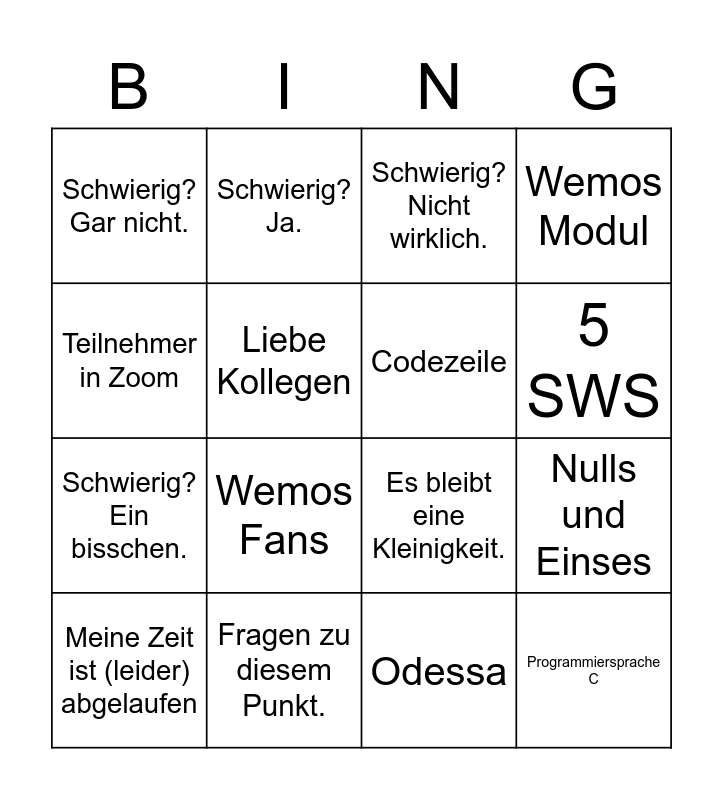 This bingo card has 16 words: Fragen zu diesem Punkt., Nulls und Einses, Schwierig? Nicht wirklich., Schwierig? Gar nicht., Schwierig? Ein bisschen., Schwierig? Ja., Es bleibt eine Kleinigkeit., Odessa, Teilnehmer in Zoom, Liebe Kollegen, Meine Zeit ist (leider) abgelaufen, Wemos Modul, Wemos Fans, 5 SWS, Codezeile and Programmiersprache C.