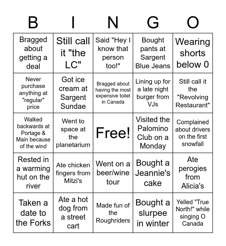 This bingo card has a free space and 29 words: Taken a date to the Forks, Pretended to be a pirate on the nonsuch, Went to space at the planetarium, Visited the St. Norbert Monastery at night, Bragged about getting a deal, Said "Hey I know that person too!", Got ice cream at Sargent Sundae, Ate chicken fingers from Mitzi's, Visited the Palomino Club on a Monday, Ate a hot dog from a street cart, Complained about drivers on the first snowfall, Yelled "True North!" while singing O Canada, Made fun of the Roughriders, Bought a slurpee in winter, Still call it the "Revolving Restaurant", Stayed in the haunted room at Hotel Fort Garry, Went on a beer/wine tour, Rested in a warming hut on the river, Wearing shorts below 0, Walked backwards at Portage & Main because of the wind, Bought a Jeannie's cake, Ate a Salisbury House Nip, Lining up for a late night burger from VJs, Never purchase anything at "regular" price, Bought pants at Sargent Blue Jeans, Still call it "the LC", Ate perogies from Alicia's, Bragged about having the most expensive toilet in Canada and Promising to attend too many socials in the same night.
