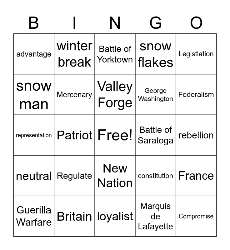 This bingo card has a free space and 24 words: Regulate, Britain, Valley Forge, Guerilla Warfare, Legistlation, advantage, snow man, winter break, Battle of Saratoga, New Nation, George Washington, representation, constitution, France, Mercenary, Marquis de Lafayette, rebellion, Battle of Yorktown, Federalism, Patriot, Compromise, neutral, snow flakes and loyalist.