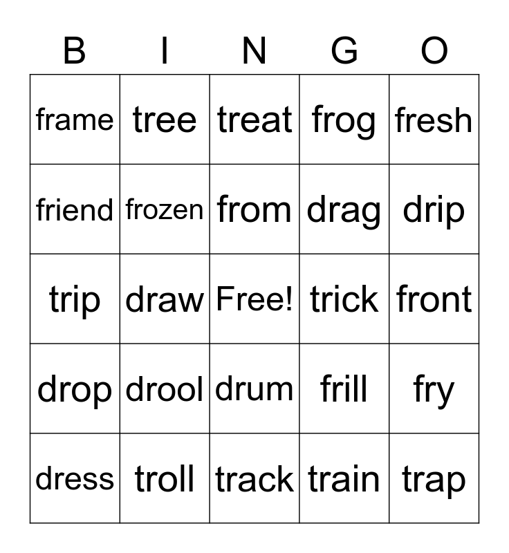 This bingo card has a free space and 24 words: drool, troll, from, dress, fresh, frame, friend, tree, trick, drum, drag, trip, frill, fry, frozen, train, front, treat, drip, draw, trap, drop, frog and track.
