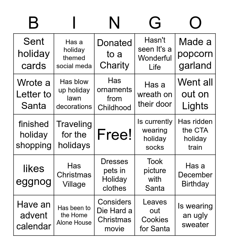 This bingo card has a free space and 29 words: Have an advent calendar, been to Christkindl Market this year, Traveling for the holidays, Has a real christmas tree, Sent holiday cards, Donated to a Charity, Has blow up holiday lawn decorations, Has Christmas Village, Is currently wearing holiday socks, Has been to the Home Alone House, Has ridden the CTA holiday train, Is wearing an ugly sweater, Considers Die Hard a Christmas movie, Leaves out Cookies for Santa, Went all out on Lights, Been Kissed under the misletoe, Dresses pets in Holiday clothes, likes eggnog, Made a popcorn garland, finished holiday shopping, Took picture with Santa, Baked cookies, Has a wreath on their door, Wrote a Letter to Santa, Hasn't seen It's a Wonderful Life, Has a holiday themed social meda, Has a December Birthday, Has ornaments from Childhood and Drives around to see lights.