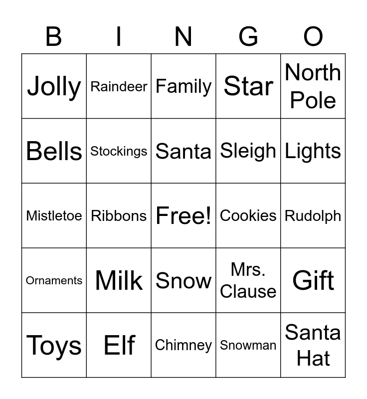 This bingo card has a free space and 26 words: Snow, Snowman, Santa, Elf, North Pole, Jolly, Bells, Raindeer, Rudolph, Mrs. Clause, Sleigh, Mistletoe, Gift, Toys, Ribbons, Christmas Tree, Star, Ornaments, Family, Santa Hat, Lights, Chimney, Cookies, Milk, Stockings and Chestnuts.