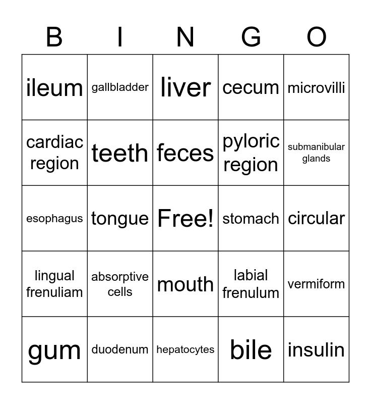 This bingo card has a free space and 24 words: gum, absorptive cells, feces, bile, microvilli, ileum, gallbladder, liver, stomach, circular, esophagus, teeth, labial frenulum, vermiform, cardiac region, duodenum, hepatocytes, cecum, submanibular glands, lingual frenuliam, tongue, mouth, pyloric region and insulin.