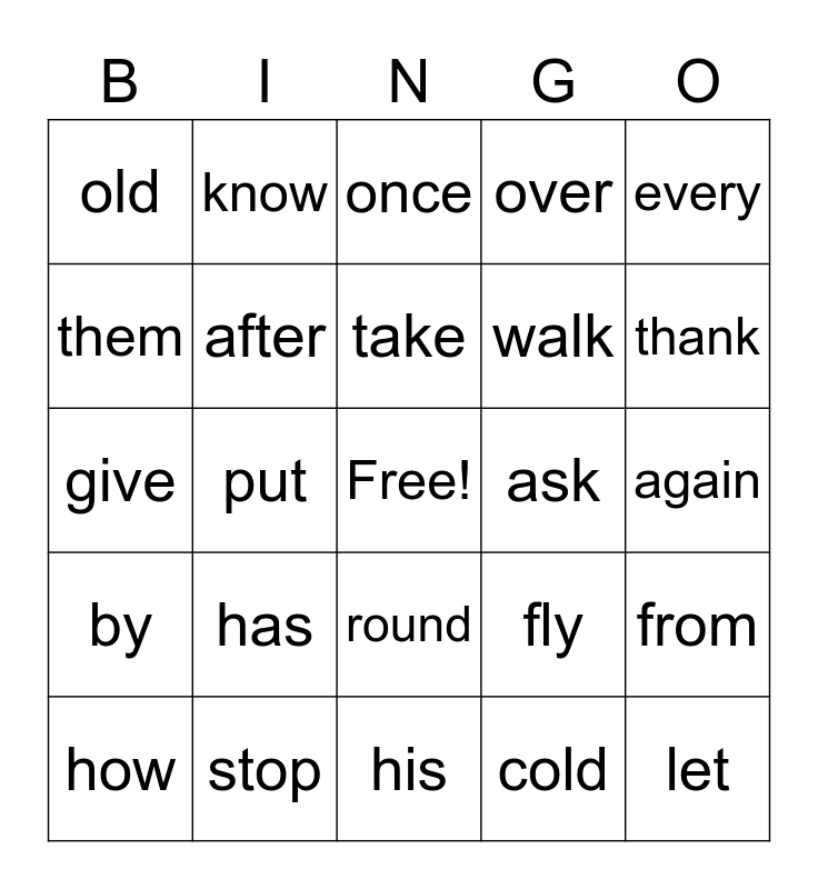 This bingo card has a free space and 24 words: has, stop, take, how, every, old, them, know, ask, round, walk, give, fly, from, after, cold, again, once, thank, put, let, by, over and his.