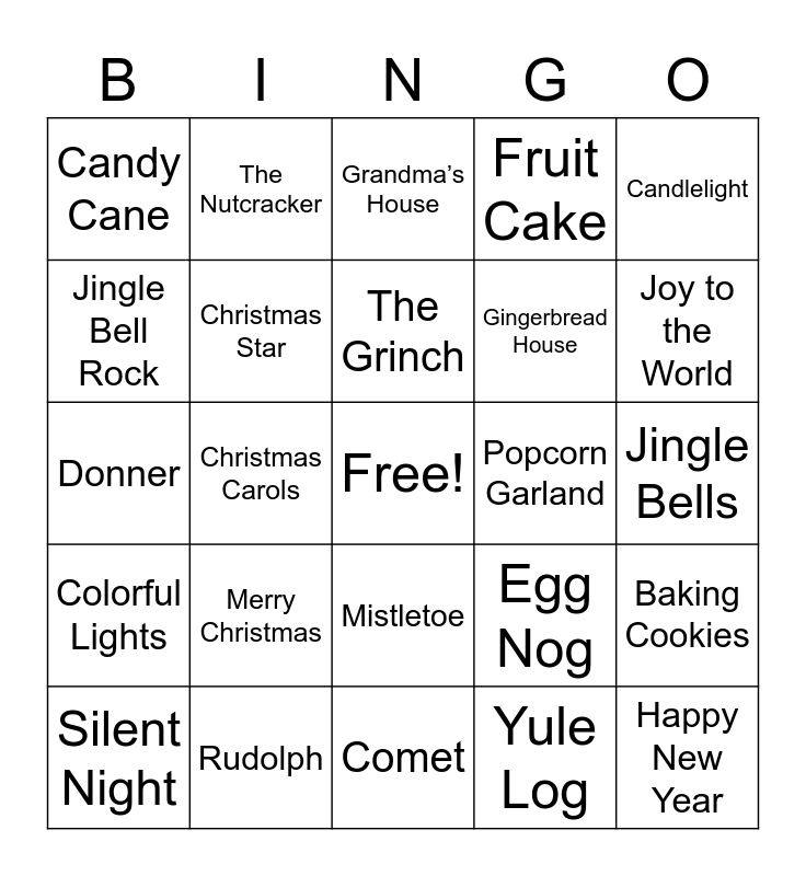 This bingo card has a free space and 90 words: Christmas Eve, Christmas Morning, Mistletoe, Turkey & Dressing, Christmas Gifts, Santa Clause, Mrs. Clause, Elves, White Christmas, The Christmas Song, Frosty the Snowman, Santa Baby, Sleigh Ride, Jingle Bells, Winter Wonderland, The Grinch, Silver Bells, Blitzen, Dasher, Dancer, Prancer, Vixen, Comet, Cupid, Donner, Rudolph, Merry & Bright, Christmas Tree, Pumpkin Pie, Pecan Pie, Stockings, Baking Cookies, Decorations, Colorful Lights, Candy Cane, Fruit Cake, Grandma’s House, Angel, Christmas Carols, Joy to the World, Silent Night, Jingle Bell Rock, Cranberry Sauce, Candied Yams, December 25th, Egg Nog, Ebenezer Scrooge, North Pole, Figgy Pudding, Sugar Plums, Garland, Gingerbread House, Hot Chocolate, Hot Cider, Letter to Santa, Poinsettia, Popcorn Garland, Santa’s Beard, Santa’s Helpers, Santa’s List, Secret Santa, Snow Angel, Socks, Stocking Stuffer, Tinsel, Wise Men, Wrapping Paper, Yule Log, Chestnuts, Jack Frost, Merry Christmas, Happy New Year, Christmas Party, Ornaments, The Nutcracker, Christmas Star, Divinity, Fudge, Ham, Christmas Ribbon, Peppermint Bark, Candlelight, Christmas Cards, Coal, Chimney, Feliz Navidad, Frankincense, Glad Tidings, Icicle and Holly Jolly Christmas.