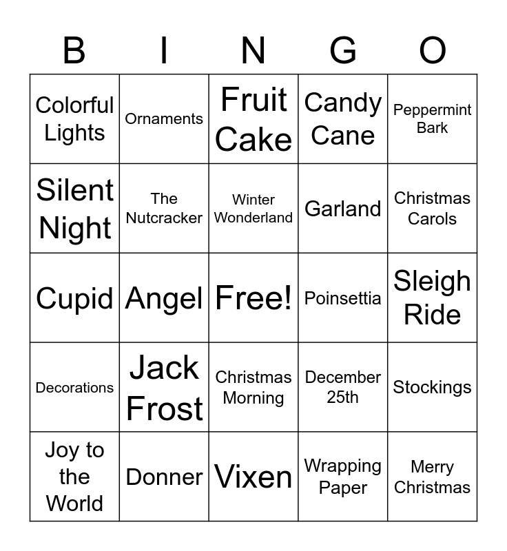 This bingo card has 1 images, a free space and 90 words: Christmas Eve, Christmas Morning, Mistletoe, Turkey & Dressing, Christmas Gifts, Santa Clause, Mrs. Clause, Elves, White Christmas, The Christmas Song, Frosty the Snowman, Santa Baby, Sleigh Ride, Jingle Bells, Winter Wonderland, The Grinch, Silver Bells, Blitzen, Dasher, Dancer, Prancer, Vixen, Comet, Cupid, Donner, Rudolph, Merry & Bright, Christmas Tree, Pumpkin Pie, Pecan Pie, Stockings, Baking Cookies, Decorations, Colorful Lights, Candy Cane, Fruit Cake, Grandma’s House, Angel, Christmas Carols, Joy to the World, Silent Night, Jingle Bell Rock, Cranberry Sauce, Candied Yams, December 25th, Egg Nog, Ebenezer Scrooge, North Pole, Figgy Pudding, Sugar Plums, Garland, Gingerbread House, Hot Chocolate, Hot Cider, Letter to Santa, Poinsettia, Popcorn Garland, Santa’s Beard, Santa’s Helpers, Santa’s List, Secret Santa, Snow Angel, Socks, Stocking Stuffer, Tinsel, Wise Men, Wrapping Paper, Yule Log, Chestnuts, Jack Frost, Merry Christmas, Happy New Year, Christmas Party, Ornaments, The Nutcracker, Christmas Star, Divinity, Fudge, Ham, Christmas Ribbon, Peppermint Bark, Candlelight, Christmas Cards, Coal, Chimney, Feliz Navidad, Frankincense, Glad Tidings, Icicle and Holly Jolly Christmas.