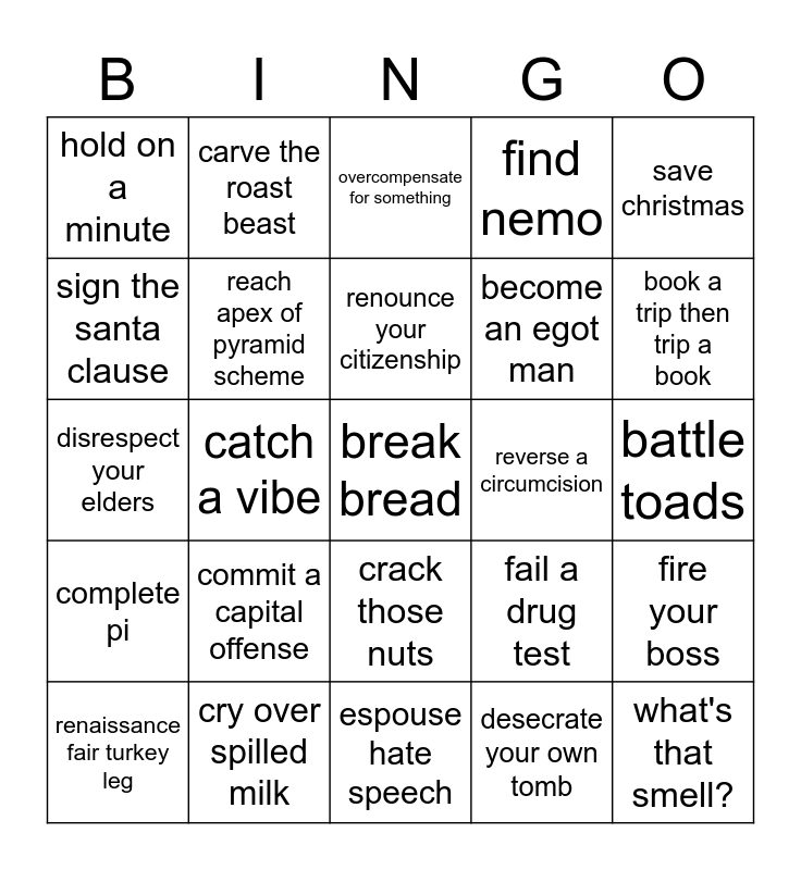 This bingo card has a free space and 24 words: commit a capital offense, cry over spilled milk, renounce your citizenship, renaissance fair turkey leg, save christmas, hold on a minute, sign the santa clause, carve the roast beast, reverse a circumcision, crack those nuts, become an egot man, disrespect your elders, fail a drug test, fire your boss, reach apex of pyramid scheme, desecrate your own tomb, battle toads, overcompensate for something, book a trip then trip a book, catch a vibe, what's that smell?, complete pi, find nemo and espouse hate speech.