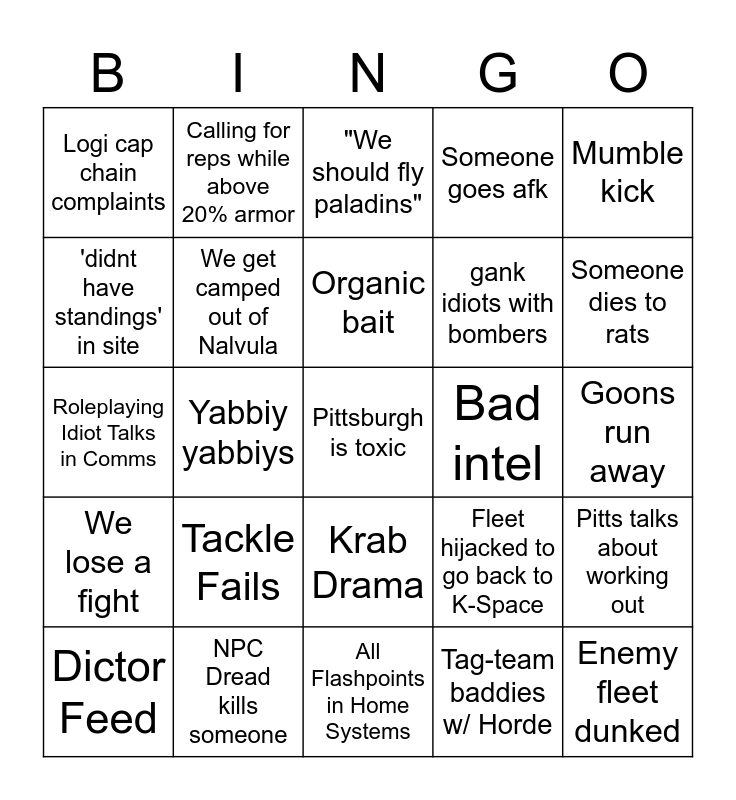 This bingo card has a free space and 29 words: Dictor Feed, Captain Sarge asks where we are, Yabbiy yabbiys, White knuckling occurs, Logi cap chain complaints, "We should fly paladins", We get camped out of Nalvula, Tackle Fails, Bad intel, NPC Dread kills someone, Goons run away, Enemy fleet dunked, All Flashpoints in Home Systems, Tag-team baddies w/ Horde, Someone dies to rats, Diplomatic Issue, Krab Drama, We lose a fight, Mumble kick, Roleplaying Idiot Talks in Comms, Fleet hijacked to go back to K-Space, Battleship vs Battleship fight, gank idiots with bombers, 'didnt have standings' in site, Someone goes afk, Calling for reps while above 20% armor, Pitts talks about working out, Organic bait and afk hostile scout killed.