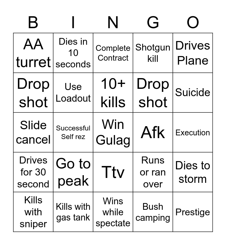 This bingo card has a free space and 24 words: Go to peak, Kills with gas tank, 10+ kills, Kills with sniper, Drives Plane, AA turret, Drop shot, Dies in 10 seconds, Afk, Ttv, Drop shot, Slide cancel, Runs or ran over, Dies to storm, Use Loadout, Bush camping, Execution, Complete Contract, Suicide, Successful Self rez, Prestige, Drives for 30 second, Shotgun kill and Wins while spectate.