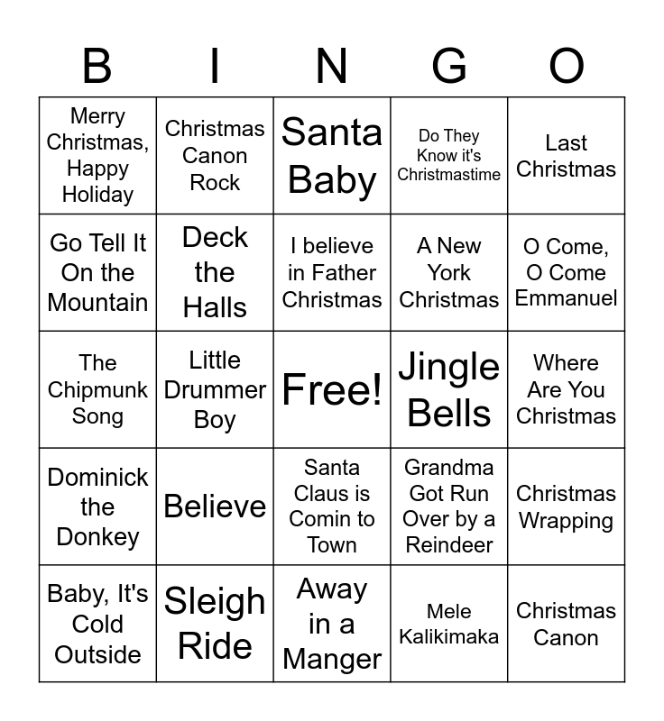 This bingo card has a free space and 50 words: All I Want for Christmas is You, Christmas Canon, All I want for Christmas is a Real Good Tan, Away in a Manger, Believe, Carol of the Bells, Christmas Canon Rock, Feliz Navidad, Go Tell It On the Mountain, First Noel, Deck the Halls, Do They Know it's Christmastime, Christmas Wrapping, Grandma Got Run Over by a Reindeer, Happy Xmas, I want a Hippopotamus, I believe in Father Christmas, Jingle Bells, Joy to the World, Last Christmas, Little Drummer Boy, Mele Kalikimaka, Merry Christmas, Happy Holiday, A New York Christmas, Nutcracker Medley, O Come All Ye Faithful, O Come, O Come Emmanuel, O Holy Night, Santa Baby, Santa Claus is Comin to Town, Silent Night, Run Rudolph Run, Rudolph the Red-Nosed Reindeer, Snoopy's Christmas, Sleigh Ride, Up On the House Top, We Three Kings, What Child is This, What Christmas Means to Me, Where Are You Christmas, Wizards in Winter, You're a Mean One, Mr. Grinch, 12 Days of Christmas, Christmas Eve/Sarajevo, Baby, It's Cold Outside, The Chipmunk Song, A Holly Jolly Christmas, The Christmas Shoes, Dominick the Donkey and It's the Most Wonderful Time of the Year.
