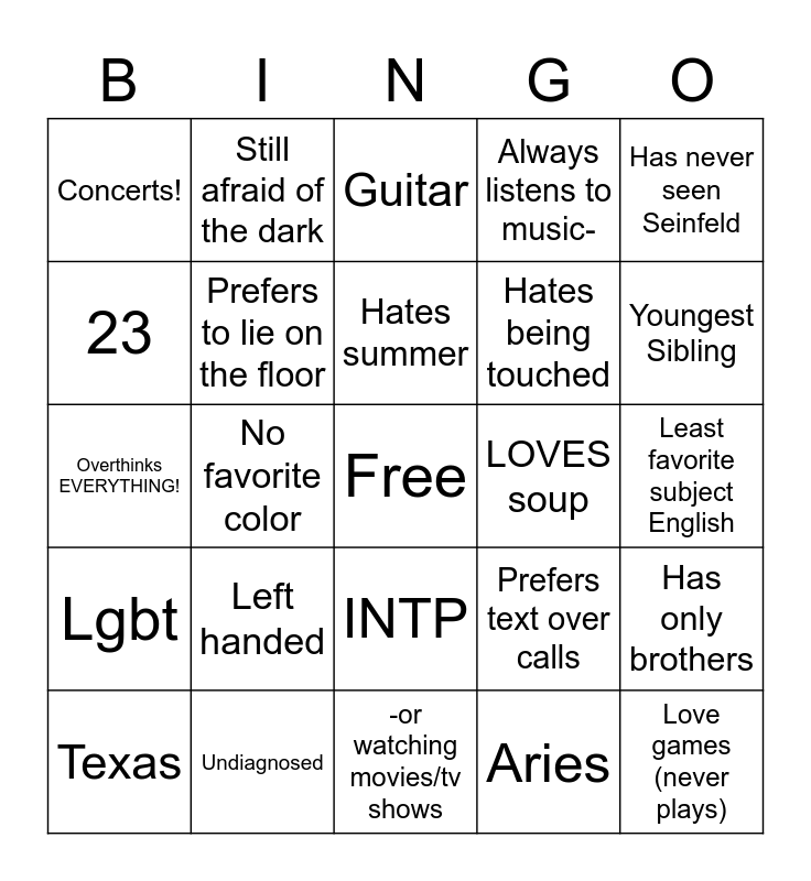 This bingo card has a free space and 24 words: Left handed, Undiagnosed, Hates summer, Texas, Has never seen Seinfeld, Concerts!, 23, Still afraid of the dark, LOVES soup, INTP, Hates being touched, Overthinks EVERYTHING!, Prefers text over calls, Has only brothers, Prefers to lie on the floor, Aries, Least favorite subject English, Guitar, Youngest Sibling, No favorite color, Love games (never plays), Lgbt, Always listens to music- and -or watching movies/tv shows.