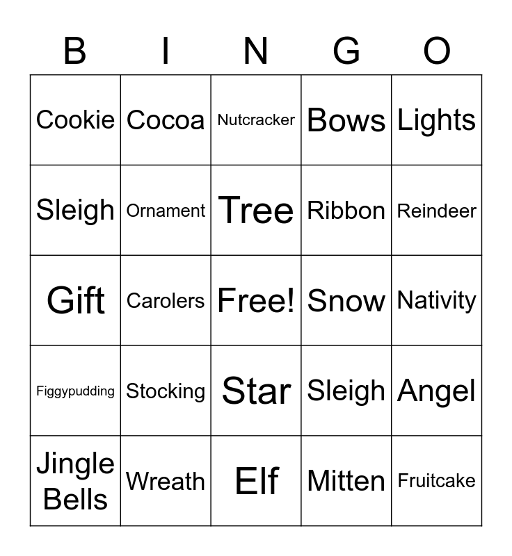 This bingo card has a free space and 24 words: Stocking, Wreath, Tree, Jingle Bells, Lights, Cookie, Sleigh, Cocoa, Snow, Star, Ribbon, Gift, Sleigh, Angel, Ornament, Mitten, Nativity, Nutcracker, Reindeer, Carolers, Fruitcake, Figgypudding, Bows and Elf.