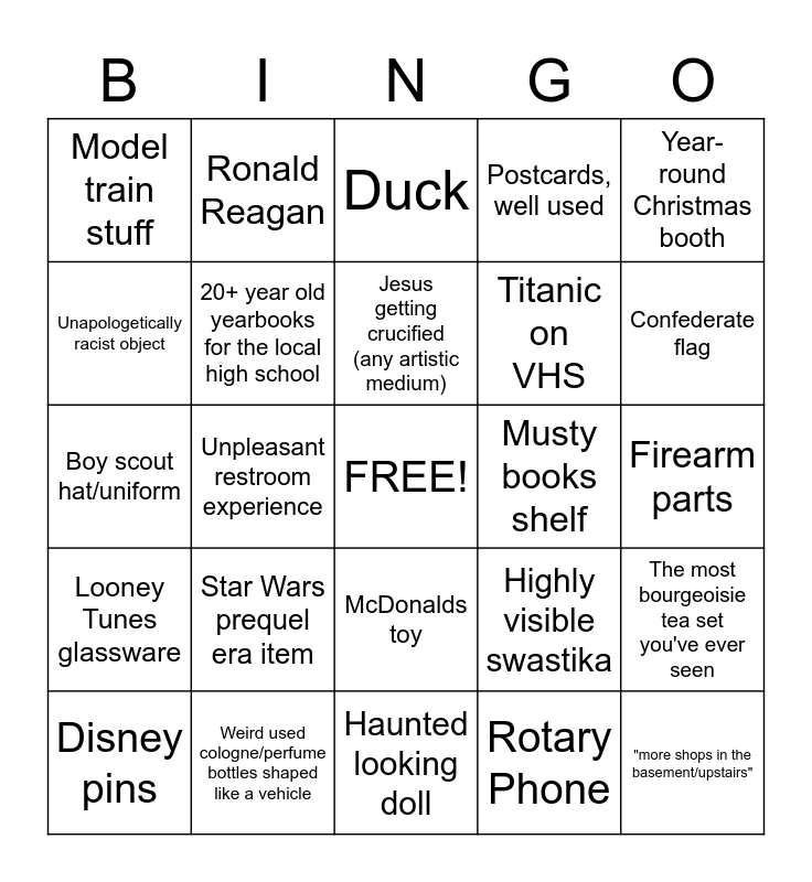 This bingo card has a free space and 27 words: Highly visible swastika, 48 Star US Flag, Titanic on VHS, Haunted looking doll, Unapologetically racist object, Duck, Ronald Reagan, Looney Tunes glassware, Musty books shelf, The most bourgeoisie tea set you've ever seen, Boy scout hat/uniform, Postcards, well used, Disney pins, Weird used cologne/perfume bottles shaped like a vehicle, Confederate flag, Telegram insulator, 20+ year old yearbooks for the local high school, Jesus getting crucified (any artistic medium), Star Wars prequel era item, Model train stuff, Firearm parts, Rotary Phone, Unpleasant restroom experience, "more shops in the basement/upstairs", McDonalds toy, Year-round Christmas booth and Globe with USSR on it.