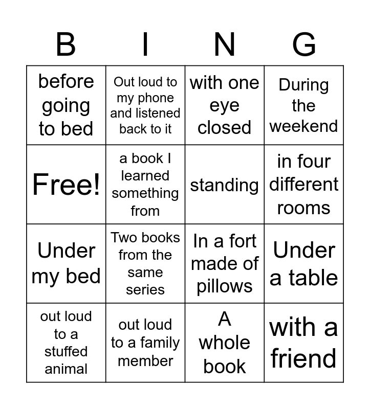 This bingo card has 16 words: out loud to a family member, Under a table, with one eye closed, before going to bed, Under my bed, Out loud to my phone and listened back to it, In a fort made of pillows, A whole book, Free!, a book I learned something from, out loud to a stuffed animal, During the weekend, Two books from the same series, in four different rooms, standing and with a friend.