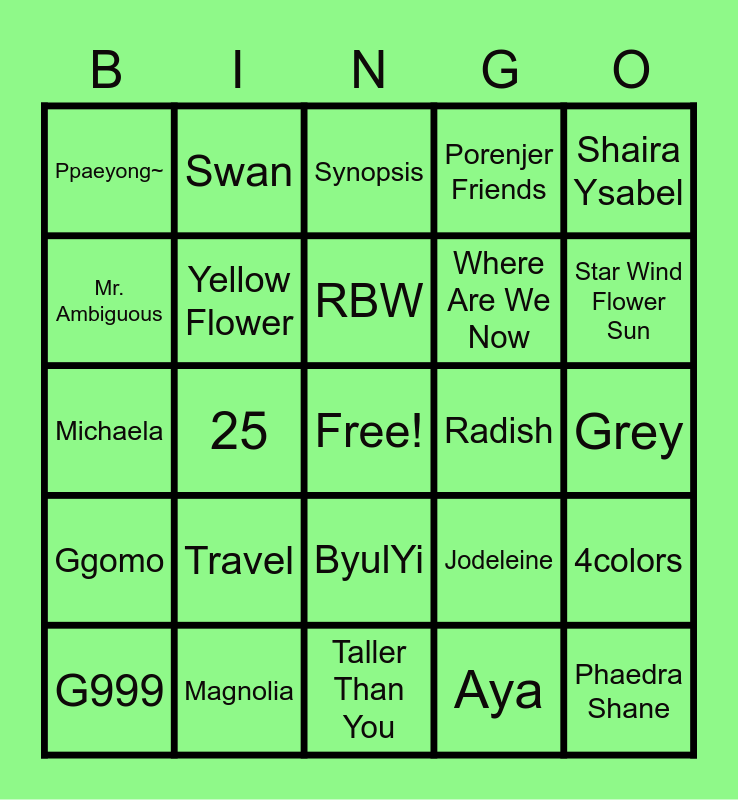 This bingo card has a free space and 111 words: Mamamoo, OT4, Moomoo, Moobong, Moomooshin, Solarsido, Spit It Out, Gamsung, Solar, Yongkey, YongSun, SoLive, Squirtle, Ddun Ddun Ddun, MoonByul, Selfish, ByulYi, Dark Side of the Moon, Eclipse, Daebak, G999, Synopsis, Janggu, SMN, Wheein, Ggomo, Magnolia, Soar, Redd, Butterfly, Ppaeyong~, 25, Goodbye, Watercolor, Hwasa, Lion, Twit, Maria, Guilty Pleasure, Gopchang, Hello Croissant~, Hyejin, I'm a 빛, I Live Alone, RBW, Melting, Taller Than You, Words Don't Come Easy, You're the Best, Girl Crush, Reality in Black, Queendom, Destiny, HIP, I Say Mamamoo: The Best, Hello, Mr. Ambiguous, Don't Be Happy, Piano Man, Um Oh Ah Yeh, Pink Funky, Memory, Décalcomanie, New York, I Love Too, Where Are We Now, Purple, Yes I Am, Wanna Be Myself, Yellow Flower, Star Wind Flower Sun, Starry Night, Red Moon, Egotistic, Blue;s, Wind Flower, Better Than I Thought, White Wind, Gogobebe, Travel, Dingga, Aya, Radish, 4colors, Twitter Space, KULTO, Porenjer Friends, Shane, Phaedra Shane, Chai, Shaira Ysabel, Ggomo, Alyssa Marie, Nine, Janine, Mica, Michaela, Niq, Jeanne Monique, Pay, Onofrea, Ami, Agatha Marie, Asha, Jodeleine, Swan, Alexandra, Jane, Angela Jane, Grey and Ashlynn.