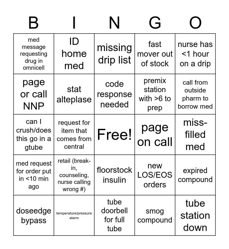 This bingo card has a free space and 40 words: compatibility question, can I crush/does this go in a gtube, TPN issue, stat alteplase, temperature/pressure alarm, floorstock insulin, code response needed, picu missing med, nurse has <1 hour on a drip, med request for order put in <10 min ago, request for item that comes from central, fast mover out of stock, tube station down, miss-filled med, page on call, retail (break-in, counseling, nurse calling wrong #), call to borrow a med, med message requesting drug in omnicell, need new tackle box, missing drip list, expired compound, smog compound, premix station with >6 to prep, page or call NNP, med sent secure returns in tube, omnicell discrepancy, med not scanning (doseedge or nurse call), trauma B/stab/OB code, expired med (not compound), call from OR, new DKA needs bags STAT, doseedge bypass, brand new TPN, new LOS/EOS orders, call from outside pharm to borrow med, tube doorbell for full tube, request for vfc vaccine, recon antibiotic, ID home med and status board clear.