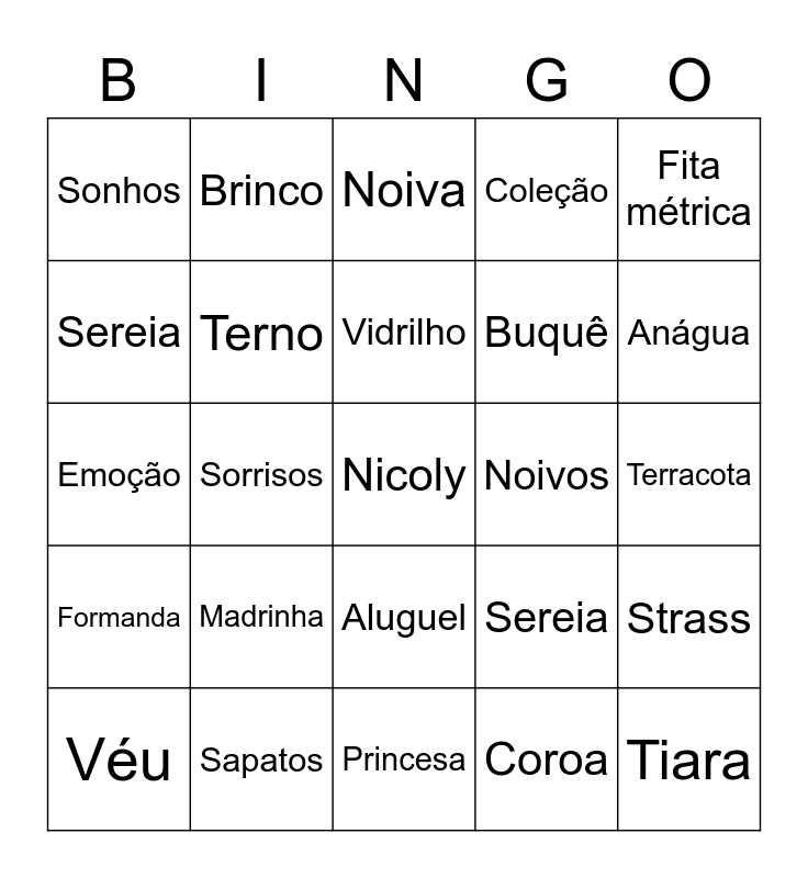 This bingo card has a free space and 29 words: azul, Sapatos, Noiva, Amor, Fita métrica, Sonhos, Terno, Vidrilho, Noivos, Strass, Véu, Sorrisos, Coroa, Tiara, Emoção, Tiara, Princesa, Sereia, Anágua, Formanda, Madrinha, Mãe da noiva, Buquê, Terracota, Sereia, Brinco, Aluguel, Coleção and Strass.