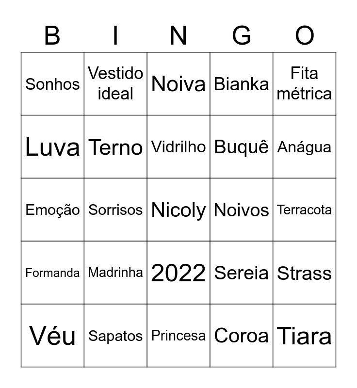 This bingo card has a free space and 29 words: azul, Sapatos, Noiva, Amor, Fita métrica, Sonhos, Terno, Vidrilho, Noivos, Strass, Véu, Sorrisos, Coroa, Tiara, Emoção, Novas metas, Princesa, Sereia, Anágua, Formanda, Madrinha, Mãe da noiva, Buquê, Terracota, Luva, Vestido ideal, 2022, Bianka and Saia.