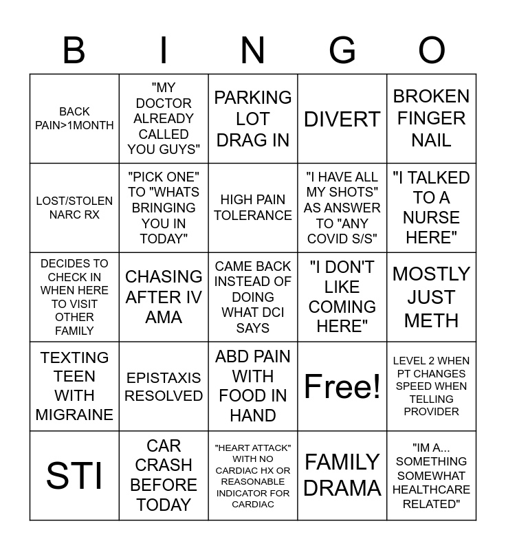 This bingo card has 25 words: EPISTAXIS RESOLVED, "HEART ATTACK" WITH NO CARDIAC HX OR REASONABLE INDICATOR FOR CARDIAC, HIGH PAIN TOLERANCE, STI, BROKEN FINGER NAIL, BACK PAIN>1MONTH, LOST/STOLEN NARC RX, "MY DOCTOR ALREADY CALLED YOU GUYS", "I DON'T LIKE COMING HERE", ABD PAIN WITH FOOD IN HAND, "I HAVE ALL MY SHOTS" AS ANSWER TO "ANY COVID S/S", DECIDES TO CHECK IN WHEN HERE TO VISIT OTHER FAMILY, Free!, LEVEL 2 WHEN PT CHANGES SPEED WHEN TELLING PROVIDER, "PICK ONE" TO "WHATS BRINGING YOU IN TODAY", "IM A... SOMETHING SOMEWHAT HEALTHCARE RELATED", MOSTLY JUST METH, PARKING LOT DRAG IN, "I TALKED TO A NURSE HERE", CHASING AFTER IV AMA, CAME BACK INSTEAD OF DOING WHAT DCI SAYS, CAR CRASH BEFORE TODAY, TEXTING TEEN WITH MIGRAINE, DIVERT and FAMILY DRAMA.