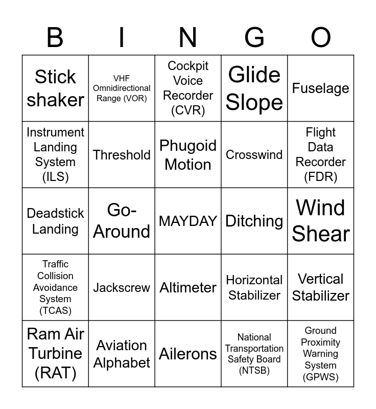 This bingo card has a free space and 25 words: Jackscrew, Ailerons, Phugoid Motion, Ram Air Turbine (RAT), Fuselage, Stick shaker, Instrument Landing System (ILS), VHF Omnidirectional Range (VOR), Ditching, Altimeter, Crosswind, Deadstick Landing, Horizontal Stabilizer, Vertical Stabilizer, Threshold, Vertical Speed Indicator (VSI), Wind Shear, Cockpit Voice Recorder (CVR), Flight Data Recorder (FDR), Go-Around, Ground Proximity Warning System (GPWS), Aviation Alphabet, Traffic Collision Avoidance System (TCAS), Glide Slope and National Transportation Safety Board (NTSB).
