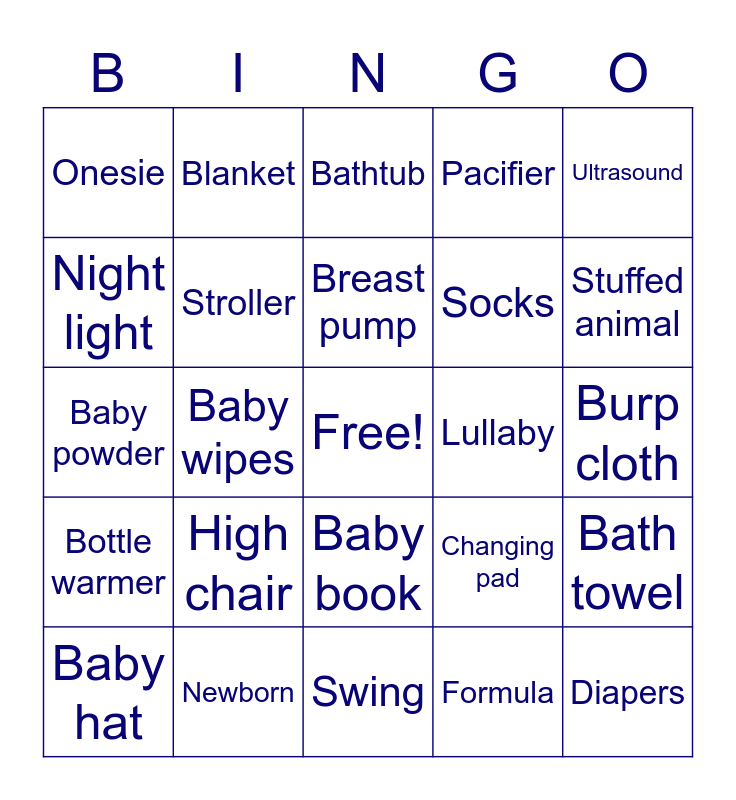 This bingo card has a free space and 46 words: Bottles, Diapers, Diaper cream, Swing, High chair, Bib, Blanket, Baby monitor, Night light, Rattle, Stroller, Pacifier, Bath towel, Changing pad, Nursery, Teething ring, Breast pump, Lullaby, Rocking chair, Ultrasound, Baby wipes, Formula, Onesie, Socks, Bassinet, Stuffed animal, Baby hat, Diaper pail, Baby book, Bottle warmer, Crib sheets, Baby lotion, Diaper bag, Pack-n-play, Swaddle, Newborn, Burp cloth, Washcloth, Car seat, Crib, Crib mobile, Bathtub, Baby powder, Cradle, Bonnet and Baby carrier.