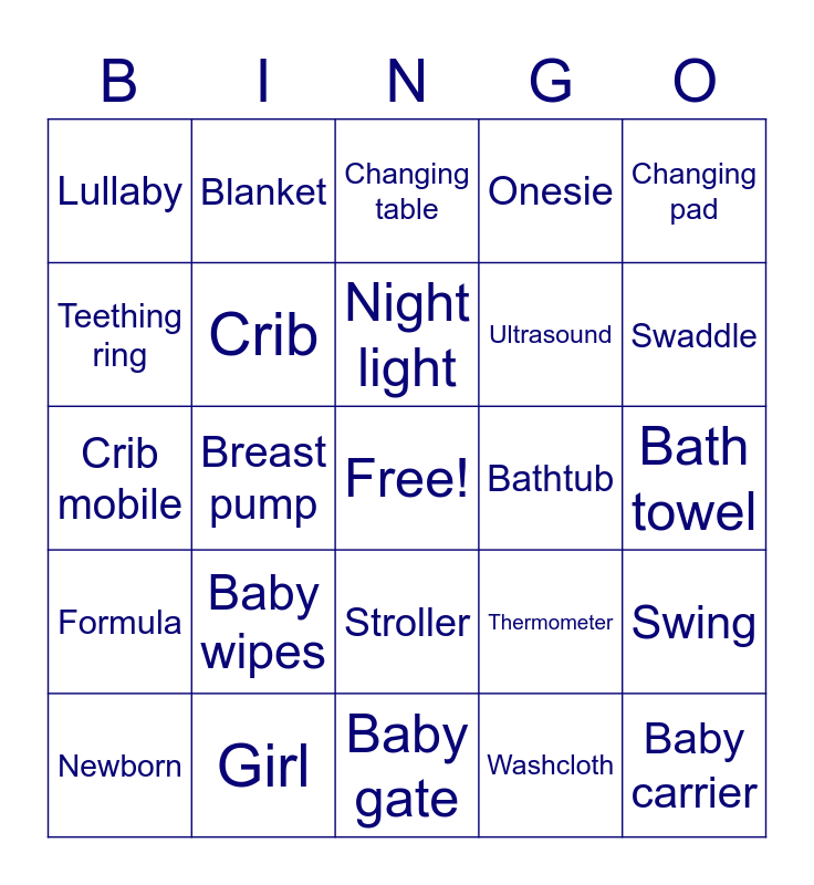This bingo card has a free space and 64 words: Bottles, Diapers, Diaper cream, Swing, High chair, Bib, Blanket, Baby monitor, Night light, Rattle, Stroller, Pacifier, Bath towel, Changing pad, Nursery, Teething ring, Breast pump, Lullaby, Rocking chair, Ultrasound, Baby wipes, Formula, Onesie, Socks, Bassinet, Stuffed animal, Baby hat, Diaper pail, Baby book, Bottle warmer, Crib sheets, Baby lotion, Diaper bag, Pack-n-play, Swaddle, Newborn, Burp cloth, Washcloth, Car seat, Crib, Crib mobile, Bathtub, Baby powder, Cradle, Bonnet, Baby carrier, Girl, Boy, Thermometer, Baby food, Mommy, Daddy, Baby gate, Play mat, Nursing pillow, Due Date, Changing table, Hamper, Toys, Baby Spoon, Labor, Delivery, Birth Announcement and Sonogram.