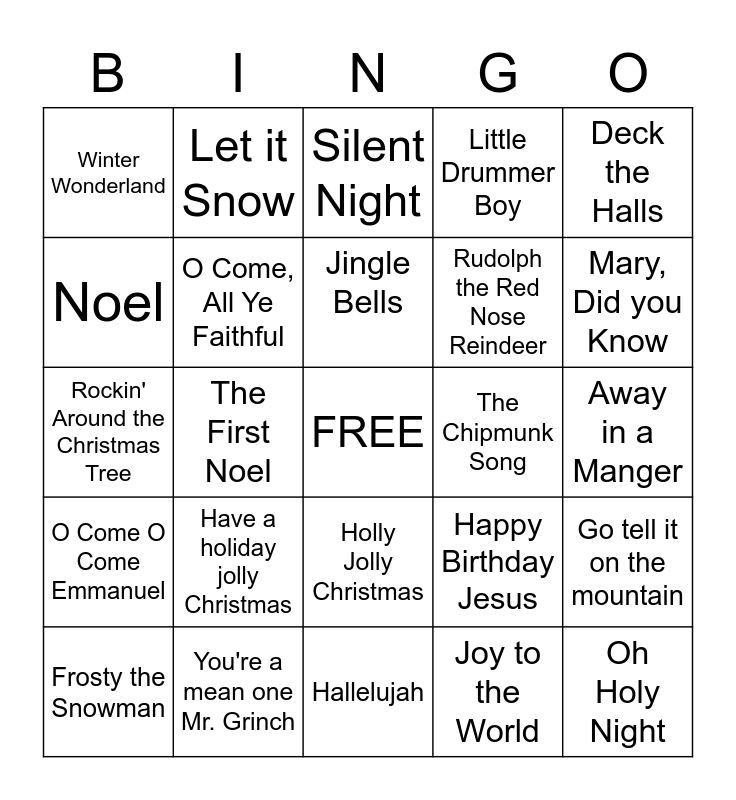 This bingo card has a free space and 24 words: Have a holiday jolly Christmas, You're a mean one Mr. Grinch, Jingle Bells, Frosty the Snowman, Deck the Halls, Winter Wonderland, Noel, Let it Snow, The Chipmunk Song, Holly Jolly Christmas, Rudolph the Red Nose Reindeer, Rockin' Around the Christmas Tree, Happy Birthday Jesus, Go tell it on the mountain, O Come, All Ye Faithful, Joy to the World, Away in a Manger, Silent Night, Mary, Did you Know, The First Noel, Oh Holy Night, O Come O Come Emmanuel, Little Drummer Boy and Hallelujah.