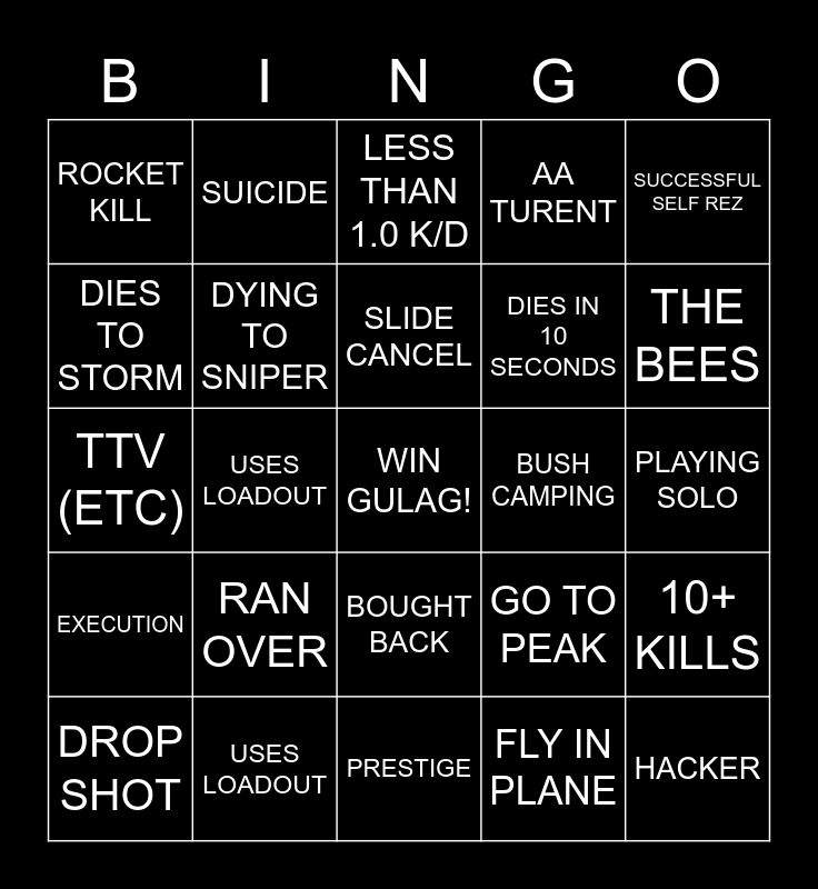 This bingo card has a free space and 26 words: DIES TO STORM, RAN OVER, PRESTIGE, FLY IN PLANE, THE BEES, ROCKET KILL, SUICIDE, LESS THAN 1.0 K/D, DIES IN 10 SECONDS, 10+ KILLS, TTV (ETC), USES LOADOUT, GO TO PEAK, HACKER, EXECUTION, KILLS WITH GAS TANK, SLIDE CANCEL, BUSH CAMPING, SUCCESSFUL SELF REZ, DROP SHOT, DYING TO SNIPER, BOUGHT BACK, AA TURENT, PLAYING SOLO, DIES TO STORM and USES LOADOUT.