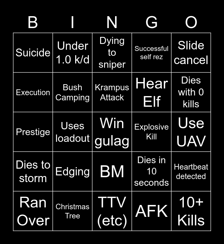 This bingo card has a free space and 24 words: Edging, Christmas Tree, Krampus Attack, Ran Over, Slide cancel, Suicide, Execution, Under 1.0 k/d, Explosive Kill, BM, Hear Elf, Prestige, Dies in 10 seconds, Heartbeat detected, Bush Camping, AFK, Use UAV, Dying to sniper, Dies with 0 kills, Uses loadout, 10+ Kills, Dies to storm, Successful self rez and TTV (etc).