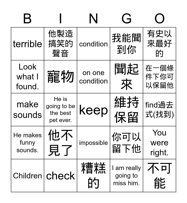 This bingo card has 57 words: Free!, Children, 孩子(複數), terrible, 糟糕的, pets, 寵物, smell, 聞起來, I can smell you., 我能聞到你, behind, 在...之後, behind the bushes, 在灌木叢後, the best ever, 有史以來最好的, He is going to be the best pet ever., 他會是有史以來最棒的寵物, keep, 維持保留, You can keep him., 你可以留下他, condition, 條件, on one condition, 在一個條件下, You can keep him on one condition., 在一個條件下你可以保留他, believe, 相信, show, 秀(給別人看), found, find過去式(找到), Look what I found., 看看我找到什麼, make sounds, 製造聲音, He makes funny sounds., 他製造搞笑的聲音, impossible, 不可能, disappear, 不見了, He disappeared., 他不見了, check, 檢查, miss, 想念, I am really going to miss him., 我會很想念他, right, 正確, You were right. and 你是對的.