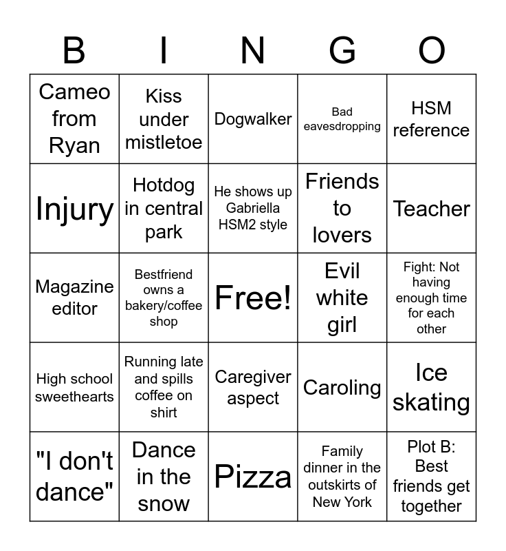 This bingo card has a free space and 24 words: Running late and spills coffee on shirt, Dance in the snow, He shows up Gabriella HSM2 style, "I don't dance", HSM reference, Cameo from Ryan, Injury, Kiss under mistletoe, Evil white girl, Caregiver aspect, Friends to lovers, Magazine editor, Caroling, Ice skating, Hotdog in central park, Family dinner in the outskirts of New York, Fight: Not having enough time for each other, Dogwalker, Teacher, Bestfriend owns a bakery/coffee shop, Plot B: Best friends get together, High school sweethearts, Bad eavesdropping and Pizza.
