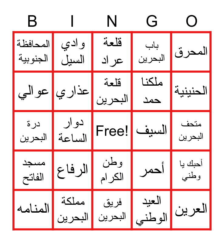 This bingo card has a free space and 24 words: الرفاع, مملكة البحرين, قلعة البحرين, المنامه, المحرق, المحافظة الجنوبية, عوالي, وادي السيل, السيف, وطن الكرام, ملكنا حمد, درة البحرين, أحمر, أحبك يا وطني, عذاري, العيد الوطني, متحف البحرين, قلعة عراد, الحنينية, دوار الساعة, العرين, مسجد الفاتح, باب البحرين and فريق البحرين.