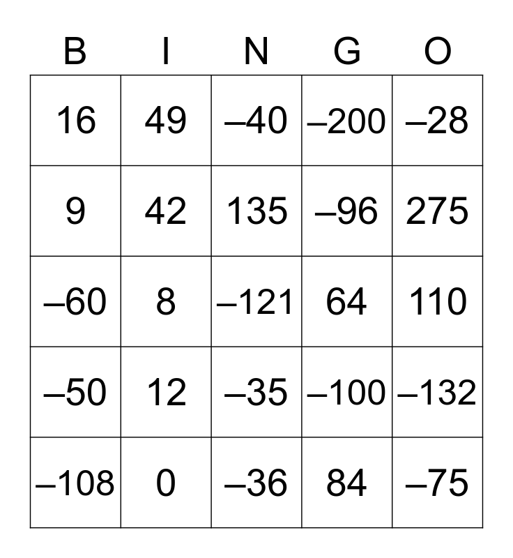 This bingo card has 30 words: 0, –1, 8, –30, 16, –40, 42, –35, 64, –36, 110, –121, 84, –75, 275, 1,000, –100, –50, 12, –28, –60, –54, 49, –96, 9, –200, –132, –108, 135 and –225.