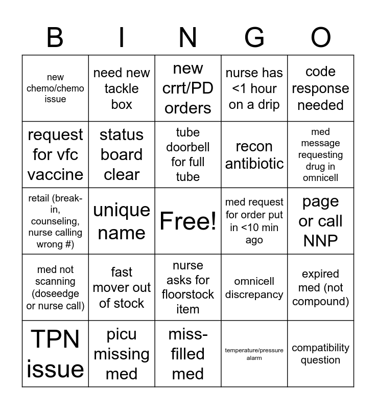 This bingo card has a free space and 44 words: missing lipid/adjust lipid time, compatibility question, call out/or >10 min late, TPN issue, stat alteplase, temperature/pressure alarm, new crrt/PD orders, floorstock insulin, code response needed, picu missing med, nurse has <1 hour on a drip, med request for order put in <10 min ago, nurse asks for floorstock item, fast mover out of stock, tube station down, miss-filled med, page on call, retail (break-in, counseling, nurse calling wrong #), call to borrow a med, med message requesting drug in omnicell, need new tackle box, expired compound, smog compound, new chemo/chemo issue, premix station with >6 to prep, page or call NNP, rec from a consult service, med sent secure returns in tube, omnicell discrepancy, med not scanning (doseedge or nurse call), trauma B/stab code/OB, expired med (not compound), new DKA needs bags STAT, doseedge bypass, unique name, brand new TPN, new LOS/EOS orders, call from outside pharm to borrow med, tube doorbell for full tube, request for vfc vaccine, recon antibiotic, ID home med, status board clear and call or message for omnicell out of stock.