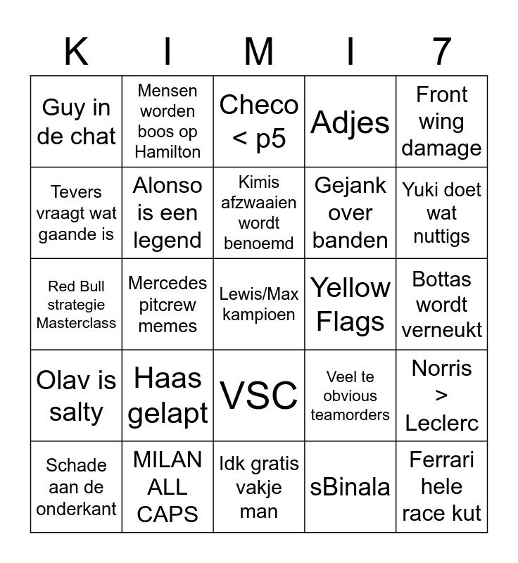 This bingo card has a free space and 24 words: Haas gelapt, MILAN ALL CAPS, Kimis afzwaaien wordt benoemd, Schade aan de onderkant, Front wing damage, Guy in de chat, Tevers vraagt wat gaande is, Mensen worden boos op Hamilton, Yellow Flags, VSC, Gejank over banden, Red Bull strategie Masterclass, Veel te obvious teamorders, Norris > Leclerc, Alonso is een legend, sBinala, Bottas wordt verneukt, Checo < p5, Yuki doet wat nuttigs, Mercedes pitcrew memes, Ferrari hele race kut, Olav is salty, Adjes and Idk gratis vakje man.