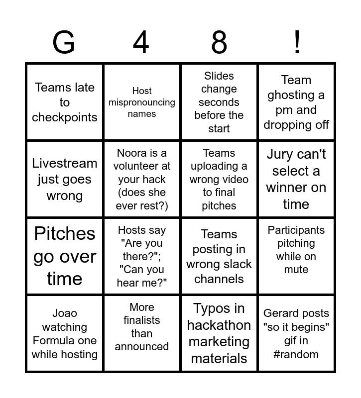 This bingo card has 16 words: More finalists than announced, Participants pitching while on mute, Slides change seconds before the start, Teams late to checkpoints, Pitches go over time, Host mispronouncing names, Teams posting in wrong slack channels, Typos in hackathon marketing materials, Livestream just goes wrong, Noora is a volunteer at your hack (does she ever rest?), Joao watching Formula one while hosting, Team ghosting a pm and dropping off, Hosts say "Are you there?"; "Can you hear me?", Jury can't select a winner on time, Teams uploading a wrong video to final pitches and Gerard posts "so it begins" gif in #random.