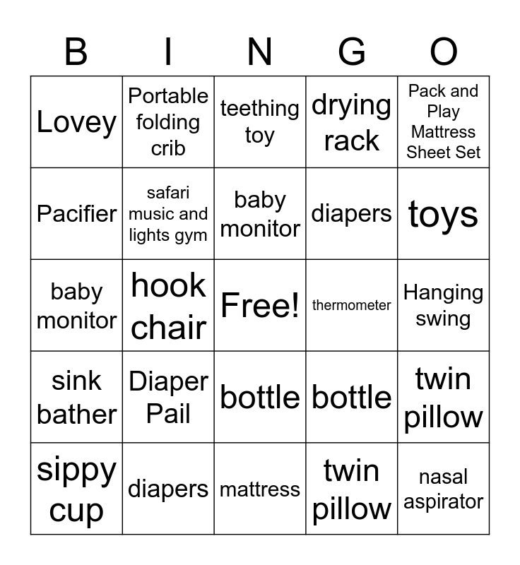 This bingo card has a free space and 26 words: bottle, twin pillow, baby monitor, diapers, Pack and Play Mattress Sheet Set, Lovey, Pacifier, Portable folding crib, Hanging swing, bottle, diapers, baby monitor, twin pillow, sippy cup, hook chair, tomato & ketchup onsie, drying rack, sink bather, teething toy, nasal aspirator, toys, mattress, thermometer, Diaper Pail, safari music and lights gym and sound machine night light.
