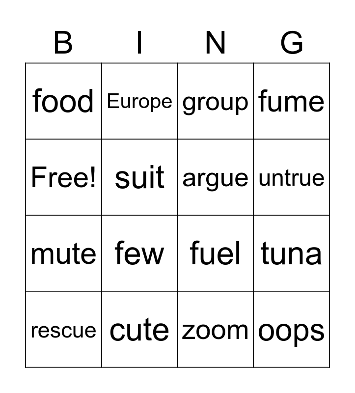 This bingo card has 16 words: cute, tuna, group, food, mute, Europe, fuel, zoom, Free!, suit, rescue, fume, few, untrue, argue and oops.