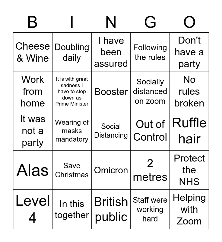 This bingo card has a free space and 25 words: Level 4, Save Christmas, Booster, Staff were working hard, No rules broken, Cheese & Wine, Doubling daily, I have been assured, Socially distanced on zoom, Protect the NHS, It was not a party, It is with great sadness I have to step down as Prime Minister, 2 metres, Helping with Zoom, Work from home, In this together, British public, Following the rules, Ruffle hair, Alas, Wearing of masks mandatory, Omicron, Out of Control, Don't have a party and Implement.