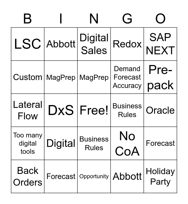 This bingo card has a free space and 66 words: CEx, ISCO, No CoA, Forecast, Pipeline, Lateral Flow, Abbott, BMX, MagPrep, SFDC, Business Rules, NA6, Oracle, SAP NEXT, Pre-pack, Custom, DxS, LSC, LSB, Demand Forecast Accuracy, Digital, Too many digital tools, Redox, Specialist, Key Accounts, Account Manager, Digital Sales, Opportunity, Holiday Party, Kazoo, Back Orders, Waiting on Tableau, CEx, ISCO, No CoA, Forecast, Pipeline, Lateral Flow, Abbott, BMX, MagPrep, SFDC, Business Rules, NA6, Oracle, SAP NEXT, Pre-pack, Custom, DxS, LSC, LSB, Demand Forecast Accuracy, Digital, Too many digital tools, Redox, Specialist, Key Accounts, Account Manager, Digital Sales, Opportunity, Holiday Party, Kazoo, Back Orders, Waiting on Tableau, CMO and K2.