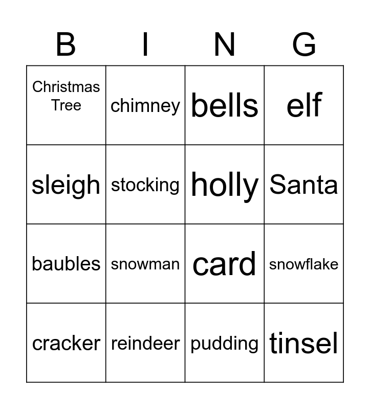 This bingo card has 16 words: reindeer, snowflake, bells, Christmas Tree, baubles, chimney, card, pudding, sleigh, stocking, cracker, elf, snowman, Santa, holly and tinsel.