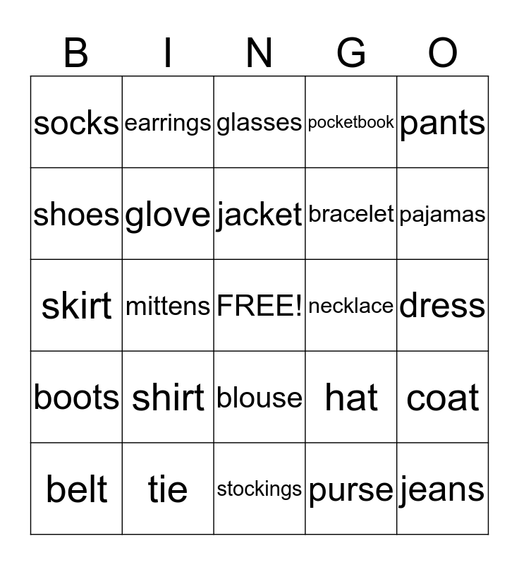 This bingo card has a free space and 24 words: shirt, tie, jacket, belt, pants, socks, shoes, earrings, necklace, blouse, bracelet, skirt, hat, coat, glove, purse, dress, glasses, pajamas, mittens, jeans, boots, pocketbook and stockings.