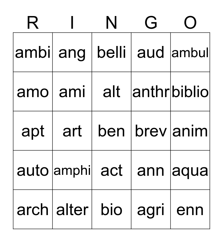 This bingo card has 26 words: act, agri, alt, alter, ambul, ambi, amo, ang, anim, ann, anthr, apt, aqua, arch, art, ast, aud, auto, belli, ben, biblio, bio, brev, amphi, ami and enn.