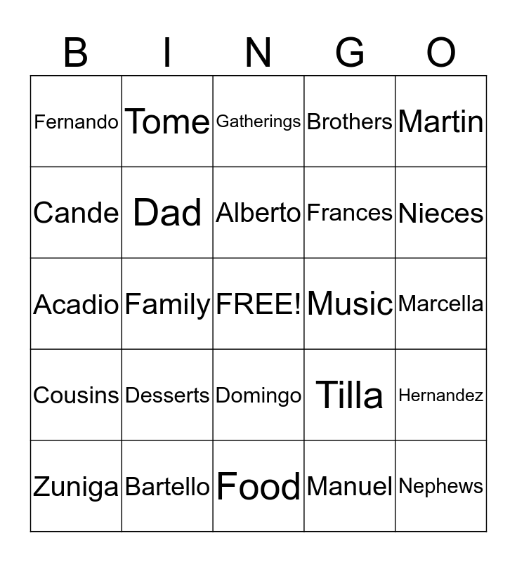 This bingo card has a free space and 26 words: Domingo, Manuel, Alberto, Bartello, Martin, Fernando, Cande, Tome, Marcella, Tilla, Frances, Acadio, Hernandez, Zuniga, Family, Sisters, Brothers, Cousins, Gatherings, Nephews, Nieces, Food, Music, Desserts, Dad and Mom.