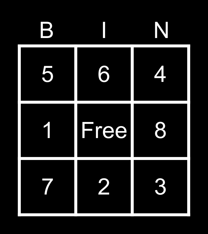 This bingo card has a free space and 8 words: 1, 6, 8, 7, 4, 5, 2 and 3.