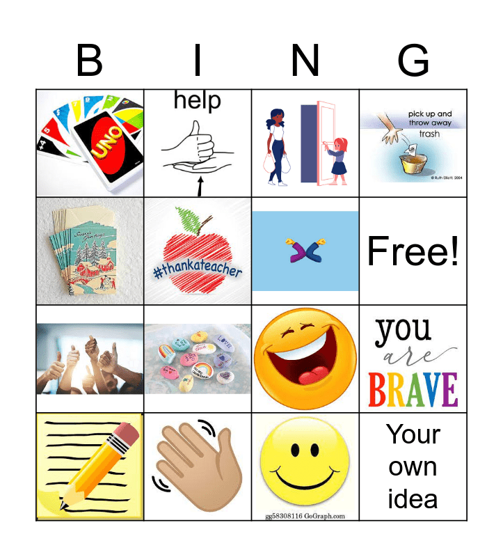This bingo card has 15 images and 2 words: Free! and Your own idea.