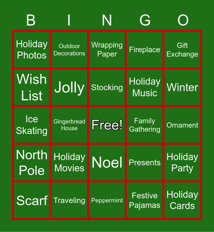 This bingo card has a free space and 47 words: Joy, Holiday Cards, Fruitcake, Peppermint, Holiday Movies, Holiday Baking, Outdoor Decorations, Holiday Lights, Wish List, Candy Canes, Jolly, Fireplace, Holiday Party, Presents, Hot Cocoa, Angel, Stocking, Family Gathering, Caroling, Gift Exchange, Gingerbread House, Festive Pajamas, Holiday Photos, Holiday Music, Eggnog, Winter, Scarf, Elves, Noel, North Pole, Mistletoe, Red, Bells, Cold, Holiday Sweater, Traveling, Ornament, Holiday Socks, Snowflake, Holiday Cheer, Miracle, Wrapping Paper, Ice Skating, Holiday Festival, Snowman, Nutcracker and Candle.