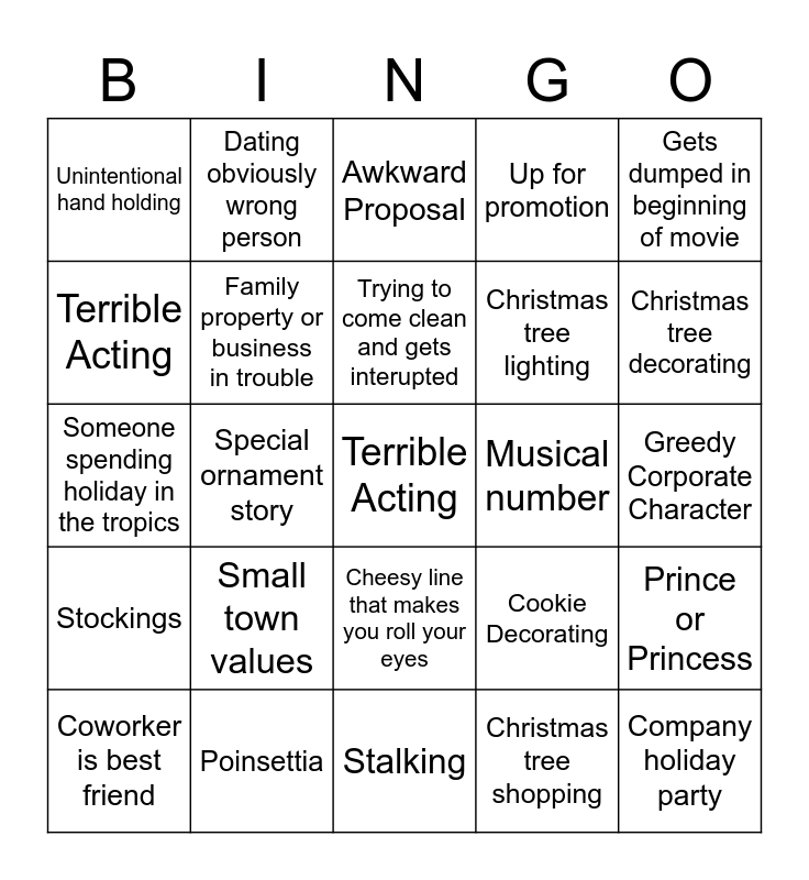 This bingo card has a free space and 76 words: Christmas Bingo, Town Christmas Festival, Awkward Proposal, Something that clearly wouldn't happen in real life, Anti-Christmas character, Horse drawn carriage or sleigh ride, Workaholic, Ice Skating, Impromptu snowball fight, Christmas PJs, Single Parent, Main characters "bump into" each other in the beginning, Trying to come clean and gets interupted, Terrible Acting, Someone with a holiday themed name, Special ornament story, Ridiculously convenient mistletoe, Company holiday party, Made up town or country, Gets dumped in beginning of movie, Terribly bad fake CGI snow, Someone spending holiday in the tropics, Family property or business in trouble, Dating obviously wrong person, Up for promotion, Christmas Caroling, First kiss interrupted, Ugly sweater, Childhood sweethearts, From a small town, Secretly royal, Sneaking around, Holiday baking, Cookie Decorating, Christmas tree decorating, Christmas tree lighting, Elderly advice, Lives in place they clearly can't afford, Greedy Corporate Character, Christmas tree shopping, Family member deceased, Turning down a job for love, Children's christmas play or pageant, "My hands are tied" or "It's out of my hands", Gift Wrapping, "I have to take this", Coworker is best friend, Unintentional hand holding, Too busy for love, Excessively decorated interior, Putting star or angel on top of christmas tree, Cheesy line that makes you roll your eyes, Car breaks down, Nagging parents, Santa like character, Property as a gift, Crazy Snowstorm that shuts down travel, Drinking hot chocolate, Drinking egg nog, Jumping to conclusions, Small town values, Small town has impressive diversity, Nativity Scene, Cute animal, Handsome single father, Montage, Musical number, Love triangle, Charity or helping homeless, Reindeer, Prince or Princess, Stockings, Poinsettia, Countdown to Christmas overlay during movie, Stalking and "Accidental Fall".