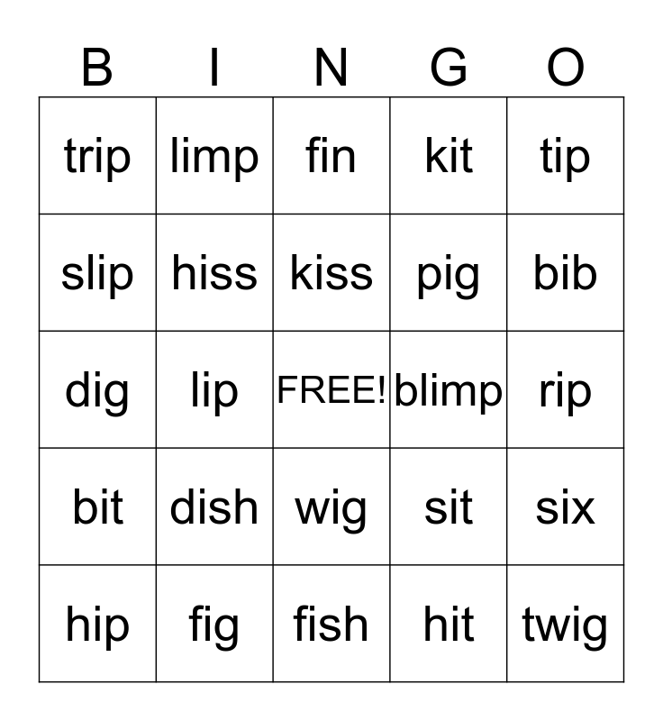This bingo card has a free space and 25 words: dish, fish, kiss, hip, tip, trip, slip, limp, blimp, wig, pig, dig, sit, six, hiss, pin, rip, fin, bib, lip, twig, fig, bit, kit and hit.