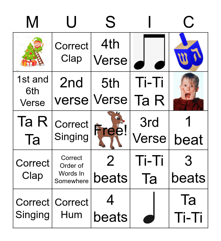 This bingo card has 5 images, a free space and 19 words: Correct Order of Words In Somewhere, Correct Hum, 5th Verse, Correct Singing, 1st and 6th Verse, Correct Clap, 3rd Verse, 2 beats, Ti-Ti Ta R, Ta R Ta, Ti-Ti Ta, 3 beats, 2nd verse, 1 beat, 4th Verse, Correct Singing, Ta Ti-Ti, Correct Clap and 4 beats.